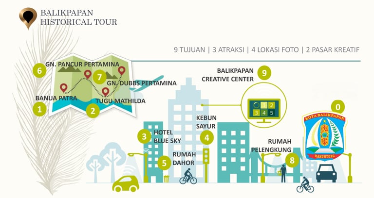 Cara tersebut dimaksudkan untuk menjadi daya ungkit peningkatan jumlah penjualan produk atau karya pegiat kreatif lokal. Disamping itu, Program Petualangan Menjelajah Sejarah Kota Balikpapan ini dapat menjadi sumber pendapatan baru (retribusi tiket), dan dalam pelaksanaannya, tidak membebani anggaran pemerintah. Pelaku kreatif yang terhimpun dalam ekosistem tersebut mendapat setidak-tidaknya dua manfaat, satu mendapat ruang berekpresi secara reguler dan berkelanjutan, kedua mendapat pendapatan rutin dari karya yang ditawarkan. Berikut Ilustrasi gagasan awal program ini ;